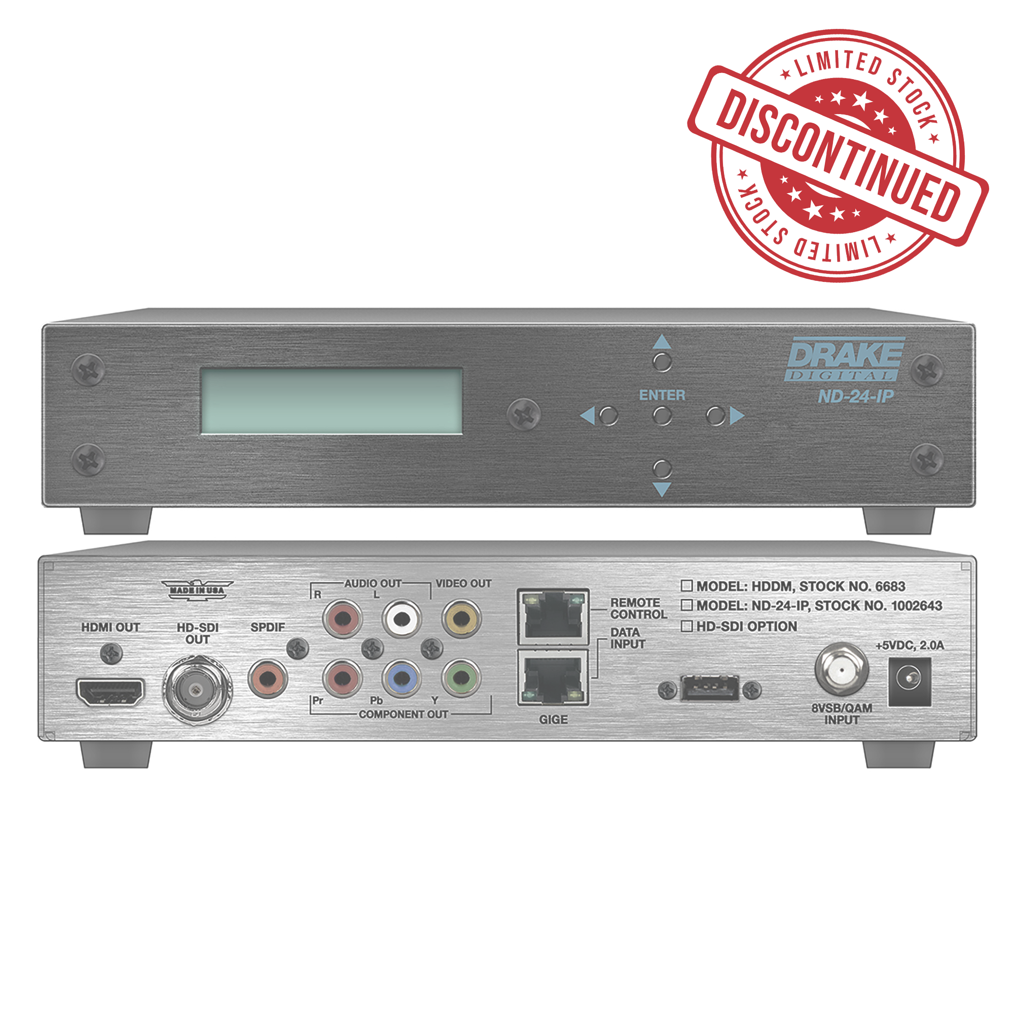 The Drake ND-24-IP is a low-cost professional MPEG-2 and H.264 decoder that is capable of receiving content from off-air, clear QAM, and IP sources. The ND-24-IP is capable of simultaneously outputting video content in SDI, HDMI and component formats. SDI outputs are available in 3G-SDI, HD-SDI, or SD-SDI formats. The unit can be used as a stand-alone high-quality decoder or used in conjunction with other IP encoders, to provide an end-to-end IP video delivery solution over a managed network.